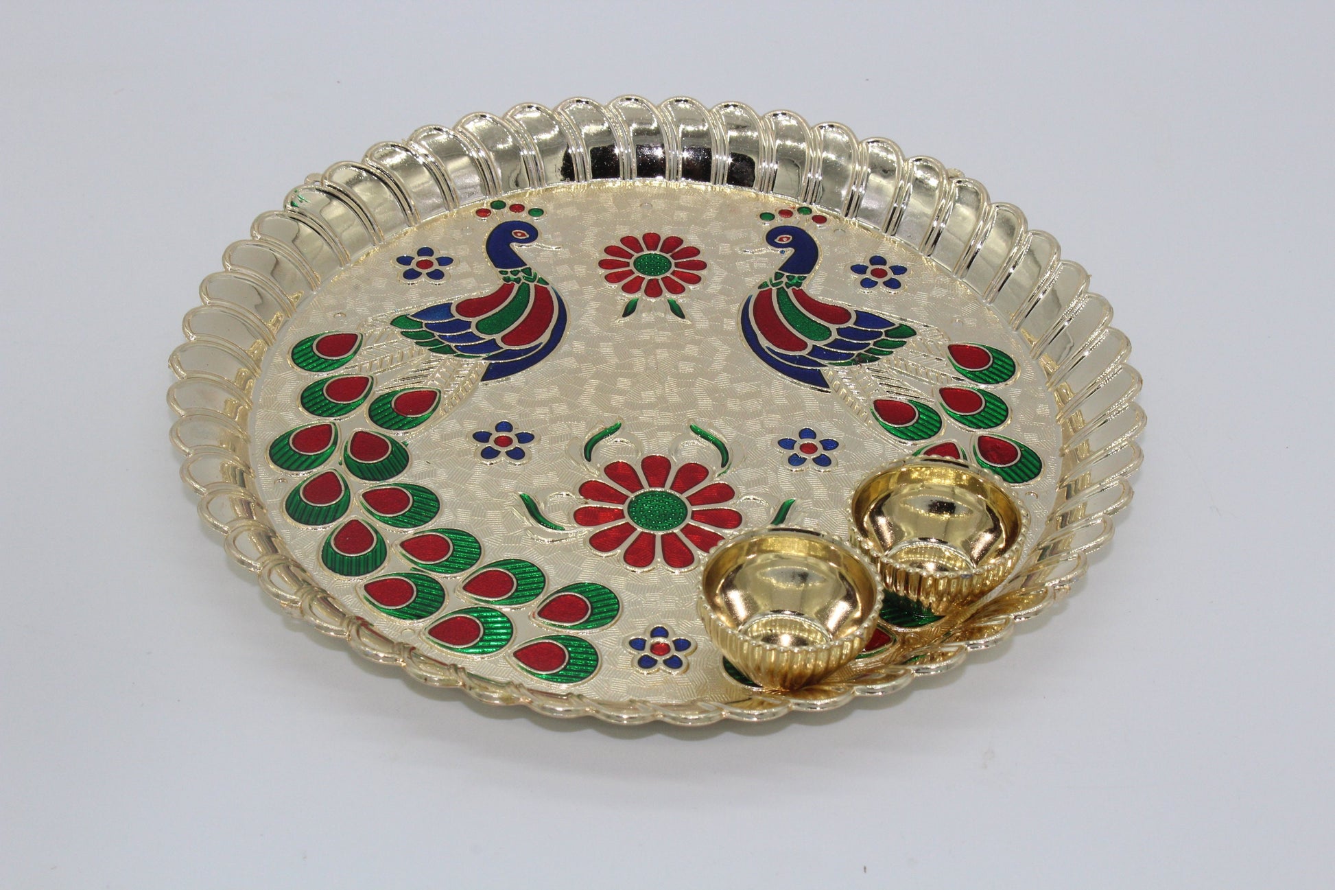 - Designer pooja thali is made of Acrylic material and decorated with meenakari work and multi-colored peacock.